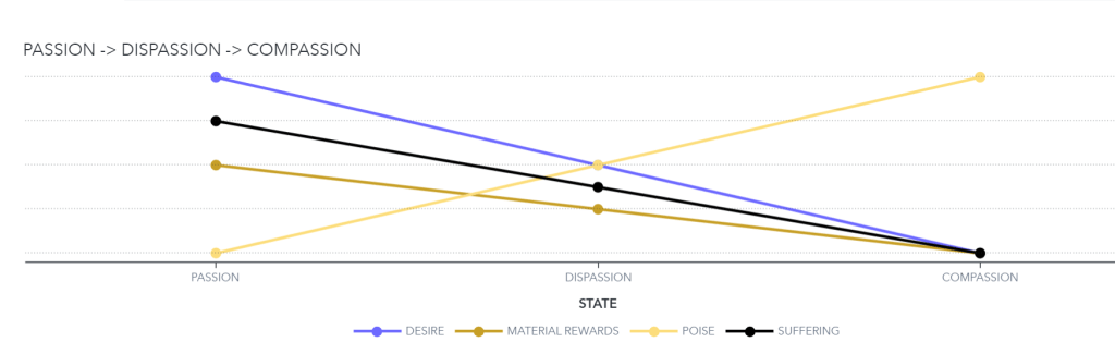 Dispassion is an important virtue, however it is temporary and doesn’t let us settle there forever. Dispassion encompasses Passion. To put in other words, dispassion is a passion without any attachment. It is individual, in a sense, you as an individual become void of any personal desire to attain certain fruits from your action. It then meets compassion!