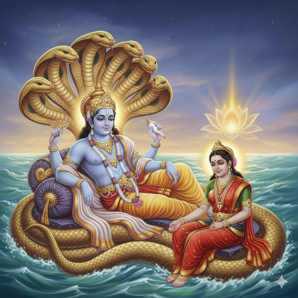 In the vast expanse of the Ksheera Sagara—the Ocean of Milk—floats a vision that contains within itself the entire mystery of existence. Here lies Maha Vishnu, the Preserver of all worlds, in a state that transcends our ordinary understanding of consciousness. He rests, yet from his rest emerges all creation. He sleeps, yet his sleep is more wakeful than our most alert moments. He reclines upon Ananta Shesha, the infinite serpent whose very name means “that which remains”—the cosmic residual that ensures reality can never be fully captured, fully known, fully algorithmatized.