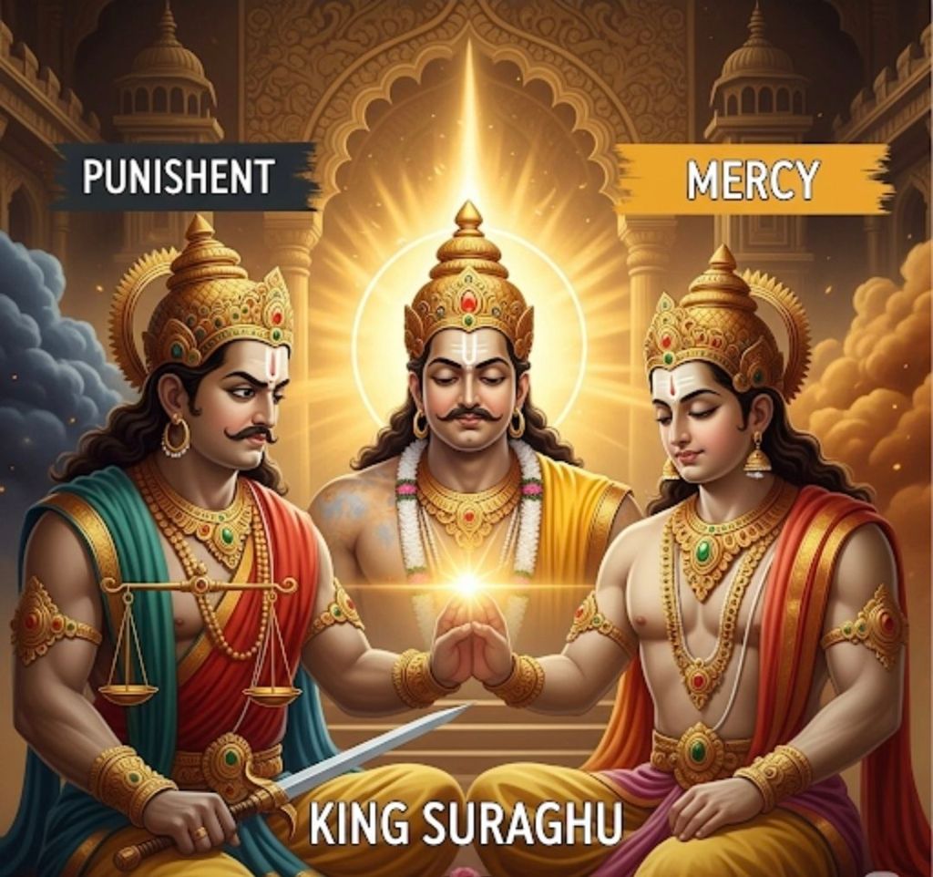 We have seen the blog being very strict in terms of delivering justice by stating justice as non-negotiable. The we saw some harsh critic on restorative or merciful deliverance of justice. Then the blog talks about the justice as everpresent and kind of a Cosmic Principle. And lastly the blog assumes a sense of gratitude and posits the grand vision of ultimate justice, the Rama Rajya as envisaged by mystic poet saint Jnaneshwar. This blog would like to cite a story in Yoga Vasistha that has a character of King Suraghu who faces the dilemma about justice in finding the right balance between tolerance and power, or between reward and punishment.